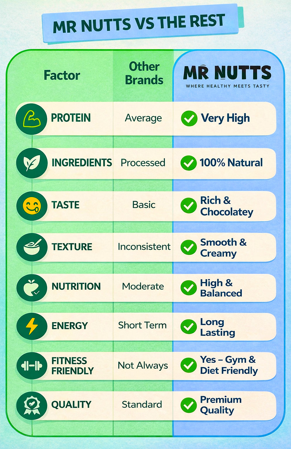 At (MR NUTTS), we believe that peanut butter is more than just a spread—it’s a wholesome, versatile ingredient that can bring joy to your meals, snacks, and even desserts. We’re passionate about crafting peanut butter that’s not only delicious but also healthy and sustainable.